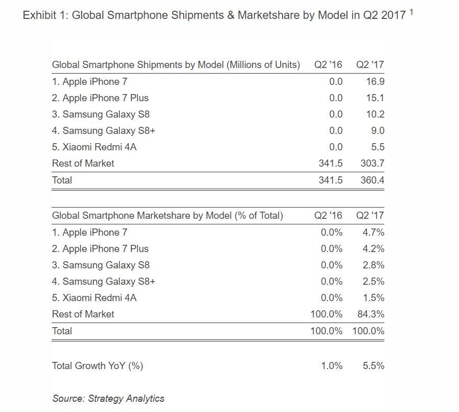 طبق گزارش منتشر شده، گوشی آیفون 7 شرکت اپل با سهم 8.9 درصدی از بازار، بالاترین جایگاه را کسب کرد و به عنوان پر فروش ترین گوشی هوشمند معرفی شد. گوشی شیائومی Redmi 4 نیز در رتبه پنجم با 1.5 درصد از سهم بازار دیده می شود. بنا بر این آمار می توان گفت که پنج گوشی برتر، حدود 15.7 درصد از سهم بازار را به خود اختصاص داده اند.