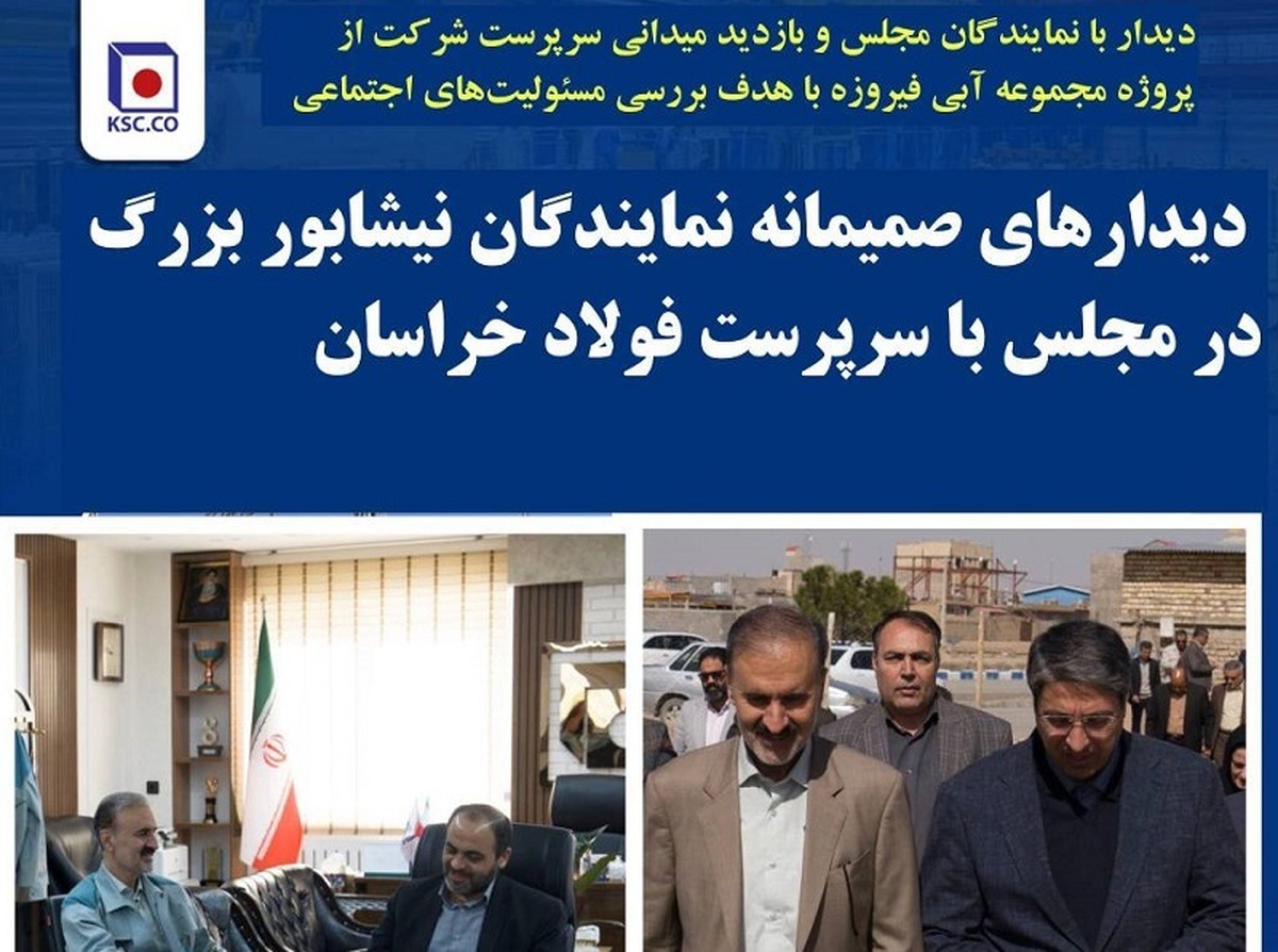 دیدار با نمایندگان نیشابور بزرگ در مجلس شورای اسلامی و بازدید میدانی از پروژه‌ی احداث محموعه ورزشی آبی دانش‌آموزی در شهرستان فیروزه تصویری از پیگیری‌های مدیریت ارشد فولاد خراسان در حوزه مسئولیت‌اجتماعی شرکت بود که امروز دوشنبه ۴ اسفند ۱۴۰۴ رقم خورد.
