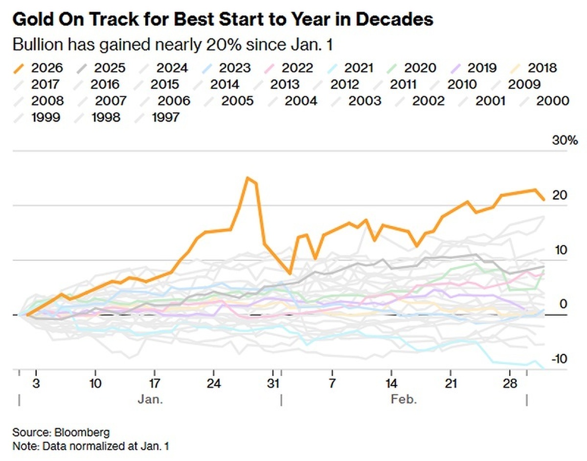 طلا در سال جاری نزدیک به یکپنجم رشد کرده و در اواخر ژانویه به رکورد تاریخی بیش از ۵۵۹۵ دلار در هر اونس رسیده است. تقاضا برای این فلز گرانبها تحت تأثیر تداوم تنشهای ژئوپلیتیک و تجاری و همچنین نگرانیها درباره استقلال فدرال رزرو آمریکا حمایت شده است.